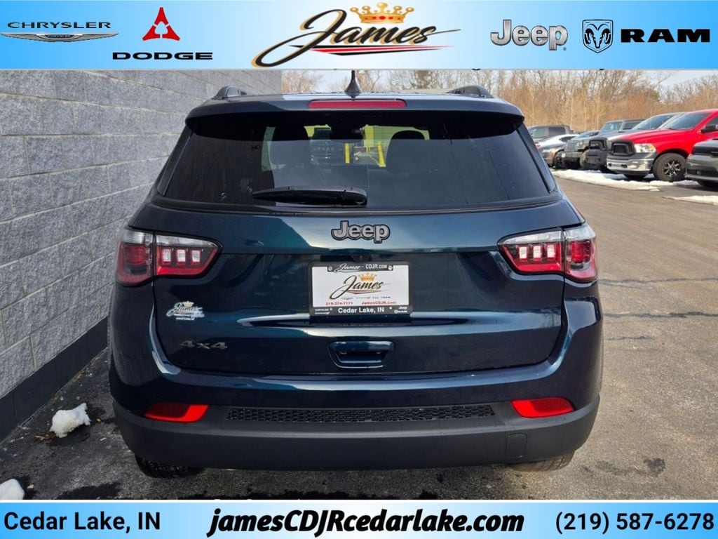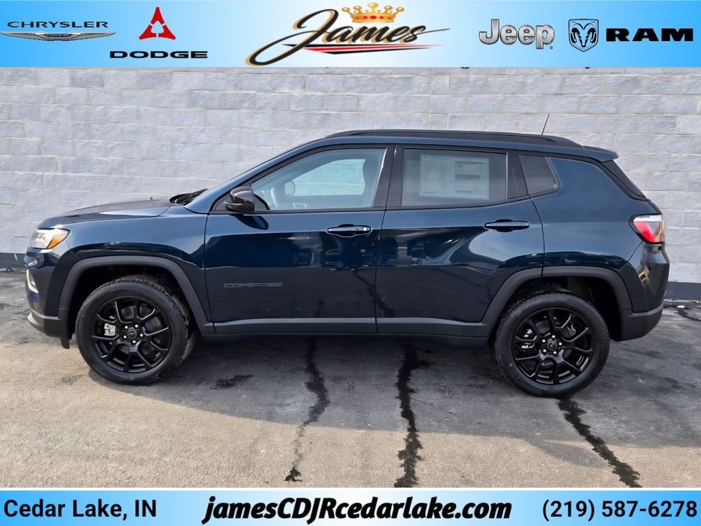 Quick Order Package 29N Altitude (10.1" Touchscreen Display, Altitude Special Edition, Black Day Light Opening Moldings, Gloss Black Surround/Neutral Gray Rings, Neutral Gray Exterior Badging, Piano Black Interior Accents, Sliding Sun Visors with Illuminated Mirrors, and Wheels: 18" x 7" Gloss Black Painted Aluminum), Compass Latitude, 4D Sport Utility, 2.0L I4 DOHC, 8-Speed Automatic, 4WD, Fathom Blue Pearl Coat, Black Cloth, 2nd Row USB Type A/C Charge Only, Air Conditioning ATC with Dual Zone Control, All-Season Floor Mats, Auto-Dimming Rear-View Mirror, Convenience Group, Foot Activated Open 'n Go Liftgate, Heated door mirrors, Humidity Sensor, Power 2-Way Driver Lumbar Adjust, Power Adjust 8-Way Driver Seat, Power Liftgate, Windshield Wiper De-Icer, 4-Wheel Disc Brakes, 6 Speakers, ABS brakes, Air Conditioning, Auto High-beam Headlights, Automatic temperature control, Delay-off headlights, Driver door bin, Driver vanity mirror, Dual front impact airbags, Dual front side impact airbags, Front Center Armrest w/Storage, Front fog lights, Fully automatic headlights, Knee airbag, Low tire pressure warning, Occupant sensing airbag, Overhead console, Panic alarm, Passenger door bin, Passenger vanity mirror, Power door mirrors, Power steering, Power windows, Rear window defroster, Rear window wiper, Security system, Speed control, Split folding rear seat, Telescoping steering wheel, Tilt steering wheel, Traction control, and Trip computer. 2026 Jeep Compass Latitude 4D Sport Utility 2.0L I4 DOHC 23/31 City/Highway MPG 8-Speed Automatic 4WD