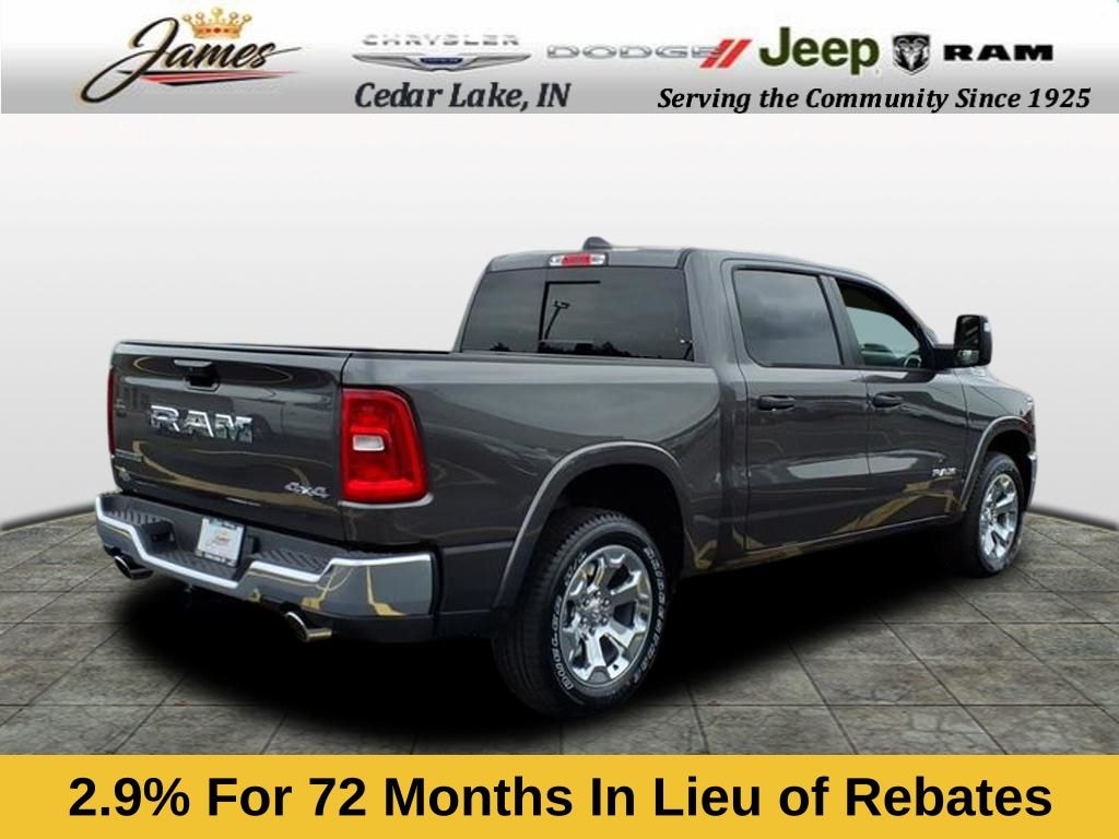 Big Horn Level 2 Equipment Group (115V Auxiliary Power Outlet, 115V Auxiliary Rear Power Outlet, 12" Touchscreen Display, 2nd Row In Floor Storage Bins, 3 Rear Seat Head Restraints, 4 Way Front Headrests, 400W Inverter, 4G LTE Wi-Fi Hot Spot, 9 Amplified Speakers w/Subwoofer, Air Conditioning ATC w/Dual Zone Control, Apple CarPlay, Auto Power-Folding Mirrors, Auto-Dimming Exterior Driver Mirror, Auto-Dimming Rear-View Mirror, Black Exterior Mirrors, Black Premium Power Mirrors, Body Color Fender Flares, Bucket Seats, Center Console Parts Module, Cluster 7.0" TFT Color Display, Configurable Drive Mode, Connected Travel & Traffic Services, Connectivity - US/Canada, Convex Wide-Angle Exterior Mirror Insert, Deluxe Cloth Bucket Seats, Disassociated Touchscreen Display, Exterior Mirrors Courtesy Lamps, Exterior Mirrors w/Heating Element, Exterior Mirrors w/Supplemental Signals, Front Seat Back Map Pockets, Full Length Floor Console, Global Telematics Box Module (TBM), Glove Box Lamp, Google Android Auto, GPS Antenna Input, GPS Navigation, HD Radio, Heated Front Seats, Heated Steering Wheel, Integrated Center Stack Radio, Integrated Voice Command w/Bluetooth, Leather Wrapped Steering Wheel, LED Dome Lamp w/On/Off Switch, LED Footwell Lighting, Manual Adjust 4-Way Front Passenger Seat, Media Hub w/2 Charge Only USBs, Overhead LED Lamps, Power 2-Way Driver Lumbar Adjust, Power Adjust 8-Way Driver Seat, Power Adjustable Pedals, Premium Overhead Console, Radio: Uconnect 5 Nav w/12.0" Display, Rear 60/40 Folding Seat, Rear Center Armrest, Rear Power Sliding Window, Rear Window Defroster, Remote Tailgate Release, Security Alarm, SiriusXM Radio Service, SiriusXM w/360L, Steering Wheel Mounted Audio Controls, Sun Visors w/Illuminated Vanity Mirrors, Universal Garage Door Opener, USB Host Flip, and Wheels: 20" x 9" Aluminum Chrome Clad (WRK)), Quick Order Package 21Z Big Horn, Trailer Tow Group (DISC) (Accent Color Tailgate Handle, Black Trailer Tow Power Mirrors, Manual Folding Exterior Mirrors, Manual Telescoping Mirrors, Mirror Clearance/Running Lights, Power-Adjustable Convex Aux Mirrors, Trailer Brake Control, Trailer Reverse Steering Control, Trailer Tire Pressure Monitoring System, and Trailer Tow Mirrors), 4-Wheel Disc Brakes, 48V Belt Starter Generator, 6 Speakers, ABS brakes, Air Conditioning, Alloy wheels, AM/FM radio, Apple CarPlay/Android Auto, Auto High-beam Headlights, Brake assist, Bumpers: chrome, Cloth Bucket Seats, Compass, Delay-off headlights, Driver door bin, Dual front impact airbags, Dual front side impact airbags, Electronic Stability Control, Front anti-roll bar, Front Bucket Seats, Front Center Armrest w/Storage, Front fog lights, Front License Plate Bracket, Front reading lights, Front wheel independent suspension, Fully automatic headlights, Heated door mirrors, Illuminated entry, Low tire pressure warning, Manual Adjust 4-Way Driver Seat, Manufacturer's Statement of Origin, MOPAR Front & Rear Rubber Floor Mats, Occupant sensing airbag, Outside temperature display, Overhead airbag, Overhead console, Panic alarm, ParkView Rear Back-Up Camera, Passenger door bin, Passenger vanity mirror, Power door mirrors, Power steering, Power windows, Radio data system, Radio: Uconnect 5 W w/8.4" Display, RAM Grille Badge - Chrome, Rear anti-roll bar, Rear step bumper, Rear Wheelhouse Liners, Remote keyless entry, Speed control, Supplier Part Tracking (J-1), Tachometer, Telescoping steering wheel, Tilt steering wheel, Traction control, Trip computer, Variably intermittent wipers, Voltmeter, and Wheels: 18" x 8" Cast-Aluminum Painted. 2026 Ram 1500 Big Horn/Lone Star 4D Crew Cab 3.0L I6 17/24 City/Highway MPG 8-Speed Automatic 4WD Price includes: $3500 - 2026 National Retail Consumer Cash . Exp. 12/01/2025