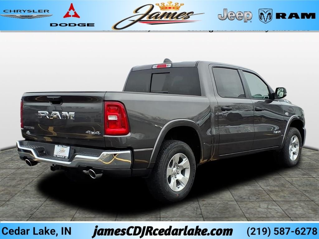 Big Horn Level 1 Equipment Group (115V Auxiliary Power Outlet, 2nd Row in Floor Storage Bins, 3 Rear Seat Head Restraints, 4 Way Front Headrests, 400W Inverter, Auto Power-Folding Mirrors, Auto-Dimming Exterior Driver Mirror, Auto-Dimming Rear-View Mirror, Black Exterior Mirrors, Black Premium Power Mirrors, Body Color Fender Flares, Bucket Seats, Center Console Parts Module, Convex Wide-Angle Exterior Mirror Insert, Deluxe Cloth Bucket Seats, Exterior Mirrors Courtesy Lamps, Exterior Mirrors with Heating Element, Exterior Mirrors with Supplemental Signals, Front Seat Back Map Pockets, Full Length Floor Console, Glove Box Lamp, Heated Front Seats, Heated Steering Wheel, Leather Wrapped Steering Wheel, Manual Adjust 4-Way Front Passenger Seat, Power 2-Way Driver Lumbar Adjust, Power Adjust 8-Way Driver Seat, Power Adjustable Pedals, Rear 60/40 Folding Seat, Rear Center Armrest, Rear Dome with on/Off Switch Lamp, Rear Power Sliding Window, Rear Window Defroster, SiriusXM Radio Service, SiriusXM Satellite Radio, Steering Wheel Mounted Audio Controls, Sun Visors with Illuminated Vanity Mirrors, and Universal Garage Door Opener), Quick Order Package 27Z Big Horn, 1500 Big Horn/Lone Star, 4D Crew Cab, HEMI 5.7L V8 Multi Displacement VVT eTorque, 8-Speed Automatic, 4WD, Granite Crystal Metallic Clearcoat, Black Cloth, Active Noise Control System, Auto High-beam Headlights, 3.92 Rear Axle Ratio, 4-Wheel Disc Brakes, 6 Speakers, ABS brakes, Air Conditioning, Delay-off headlights, Driver door bin, Dual front impact airbags, Dual front side impact airbags, Front Center Armrest w/Storage, Front Extra Heavy Duty Shock Absorbers, Front fog lights, Heated door mirrors, Low tire pressure warning, Occupant sensing airbag, Overhead console, Panic alarm, Passenger door bin, Passenger vanity mirror, Power door mirrors, Power steering, Power windows, Rear Extra Heavy Duty Shock Absorbers, Rear Wheelhouse Liners, Security Alarm, Tachometer, Telescoping steering wheel, Tilt steering wheel, Traction control, and Trip computer. 2026 Ram 1500 Big Horn/Lone Star 4D Crew Cab HEMI 5.7L V8 Multi