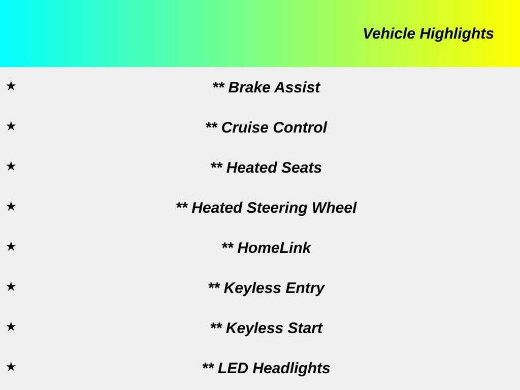 ** Adaptive Cruise Control, ** Alloy Wheels / Premium Wheels, ** Apple CarPlay/Android Auto, ** Automatic Emergency Braking, ** AWD/All Wheel Drive, ** Backup Camera, ** Blind Spot Monitor, ** Bluetooth, Hands Free, ** Brake Assist, ** Cruise Control, ** Heated Seats, ** Heated Steering Wheel, ** HomeLink, ** Keyless Entry, ** Keyless Start, ** LED Headlights, ** Lane Departure Warning, ** Leather Seats, ** Memory Seat, ** Navigation System, ** Panoramic Roof / Sunroof, ** Power Driver Seat, ** Power Driver and Passenger Seats, ** Portable Audio Connection, ** Premium Sound System / Premium Audio, ** Rain Sensing Wipers, ** Remote Start, ** Satellite Radio, ** Stability Control, ** Steering Wheel Controls, ** Sunroof / Moonroof, ** Dual Pane Panoramic Sunroof/ Moonroof, ** WiFi Hotspot, ** Universal Garage Door Opener, Driver Attention Alert, Highway Assist System, Intelligent Speed Assist (ISA), Leather Dash & Upper Doors, Traffic Jam Assist, Traffic Sign Recognition, Wheels: 19" x 8.0" Sport 5-Hole Aluminum.