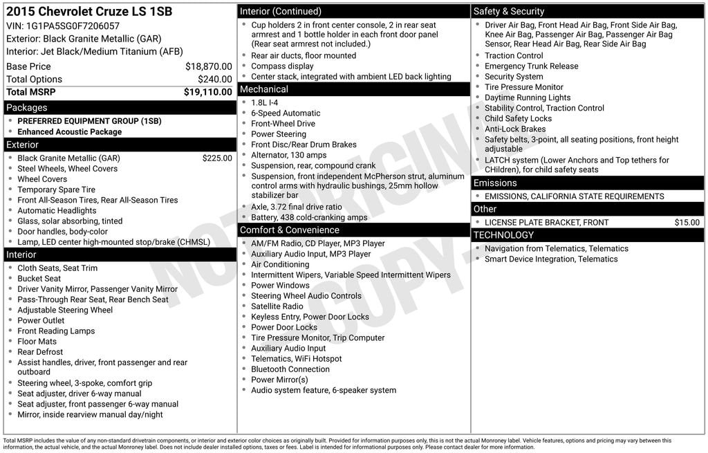Recent Arrival! 2015 Chevrolet Cruze LS Black Granite Metallic