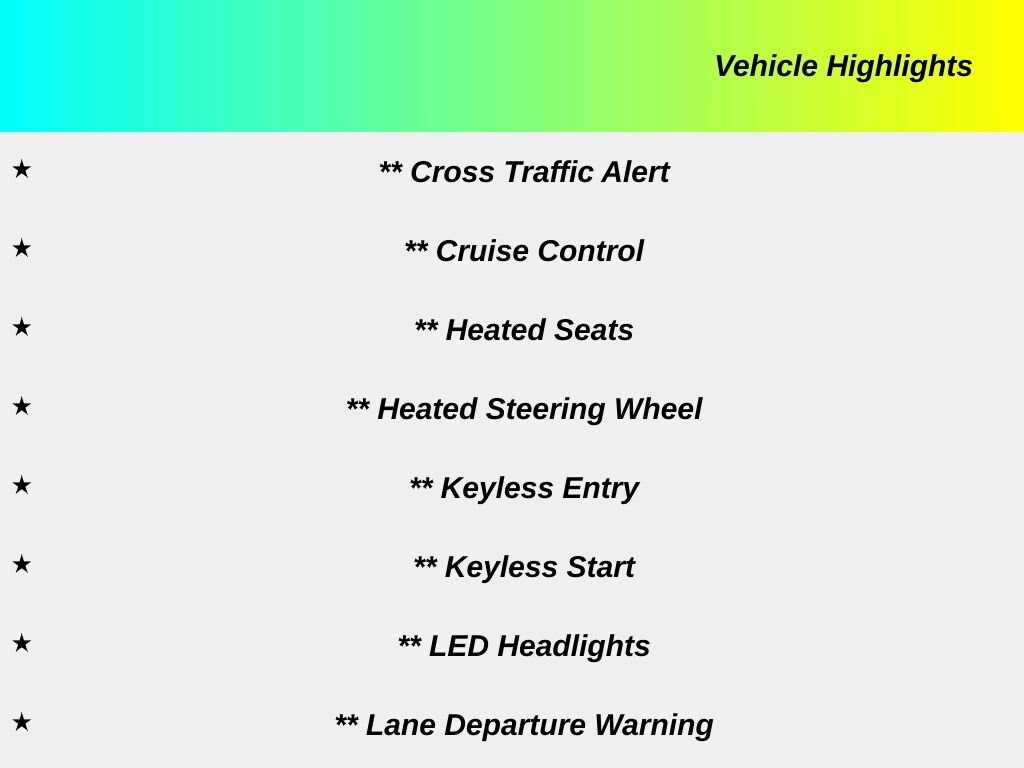 LED headlights, LED brake lights, fog lamps, and daytime running lights