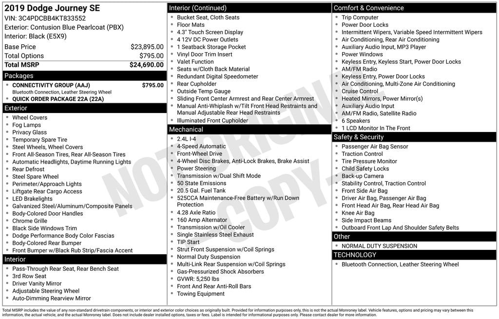 Recent Arrival! 2019 Dodge Journey SE CLEAN CARFAX, 7 PASSENGER SEATING/ 3RD ROW SEATS, TOUCH SCREEN DISPLAY, PUSH BUTTON START, BLUTOOTH, LOCAL TRADE IN, PARKVIEW REAR BACK UP CAMERA, STEERING WHEEL W/ AUDIO CONTROLS, INTEGRATED VOICE COMMAND W/ BLUETOOTH, DEEP TINT SUNSCREEN (PRIVACY) GLASS, Journey SE, 4D Sport Utility, 2.4L I4 DOHC 16V Dual VVT, 4-Speed Automatic VLP, FWD, Contusion Blue Pearlcoat, Black Cloth, 3rd row seats: bench, 4.3" Touch Screen Display, ATC w/3-Zone Temperature Control, Auto-dimming Rear-View mirror, AutoStick Automatic Transmission, Connectivity Group, Delay-off headlights, Driver vanity mirror, Front Bucket Seats, Front Center Armrest, Front dual zone A/C, Front fog lights, Front reading lights, Fully automatic headlights, Heated door mirrors, Illuminated entry, Leather Wrapped Steering Wheel, Outside temperature display, Panic alarm, ParkView Rear Back-Up Camera, Passenger door bin, Power door mirrors, Premium Cloth Low-Back Bucket Seats, Quick Order Package 22A, Rear air conditioning, Rear reading lights, Rear seat center armrest, Rear window wiper, Reclining 3rd row seat, Remote keyless entry, Roof rack: rails only, Speed control, Speed-Sensitive Wipers, Split folding rear seat, Tachometer, Telescoping steering wheel, Tilt steering wheel, TIP Start, Trip computer, Uconnect Voice Command w/Bluetooth, Variably intermittent wipers. Contusion Blue Pearlcoat