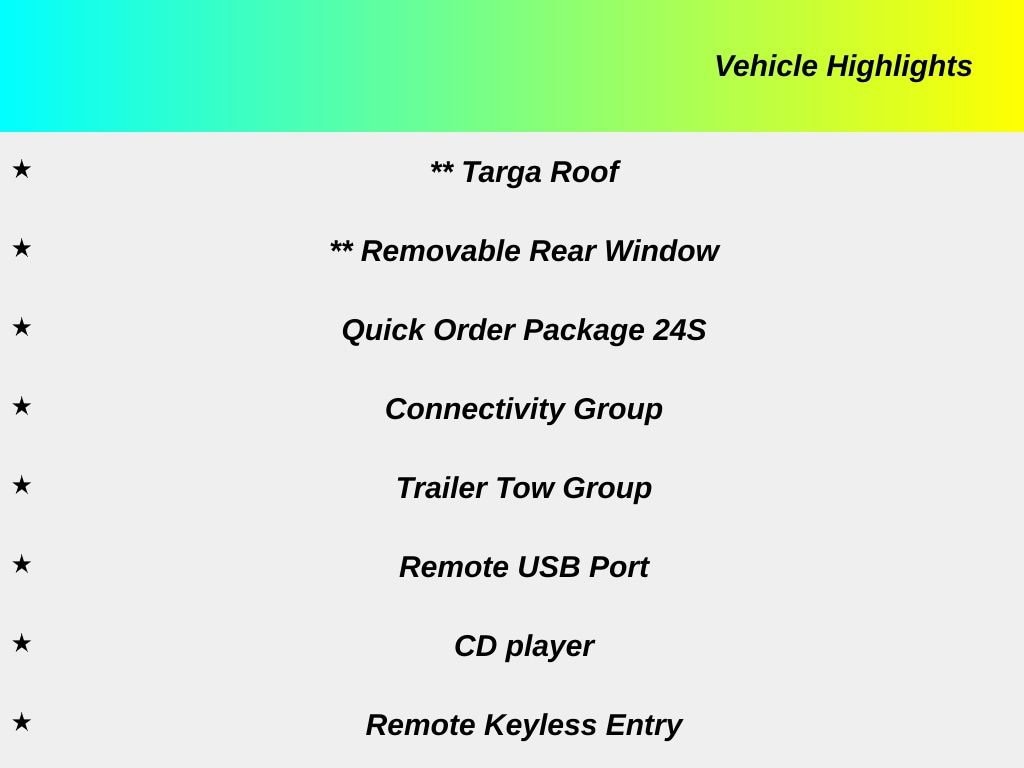 ** 4x4 / Four Wheel Drive /4WD, ** Bluetooth, Hands Free, ** Cruise Control, ** Satellite Radio, ** Stability Control, ** Steering Wheel Controls, ** Tow Hitch / Trailer Hitch, ** USB Port, ** Targa Roof, ** Removable Rear Window, Wrangler Unlimited Sport, 4D Sport Utility, 3.6L V6 24V VVT, 5-Speed Automatic, 4WD, Black Clearcoat, Black Cloth, 17" x 7.5" Aluminum Wheels, Auto-Dimming Mirror w/Reading Lamp, CD player, Chrome/Leather Wrapped Shift Knob, Class II Receiver Hitch, Connectivity Group, Deep Tint Sunscreen Windows, Front 1-Touch Down Power Windows, Front fog lights, Leather Wrapped Steering Wheel, Power Convenience Group, Power Heated Mirrors, Power Locks, Quick Order Package 24S, Remote Keyless Entry, Remote USB Port, Security Alarm, Tire Pressure Monitoring Display, Trailer Tow Group, Trailer Tow w/4-Pin Connector Wiring, Uconnect Voice Command w/Bluetooth, Vehicle Information Center.