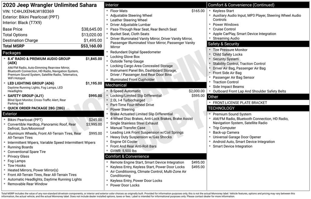 Bikini Pearlcoat 2020 Jeep Wrangler 4D Sport Utility Unlimited Sahara 2.0L I4 DOHC 21/22 City/Highway MPG 8-Speed Automatic 4WD