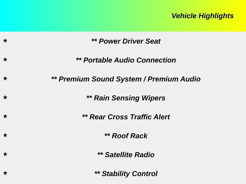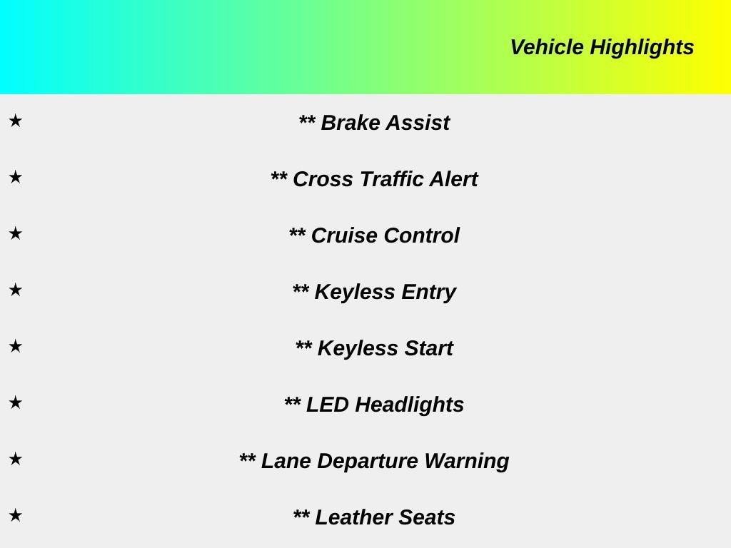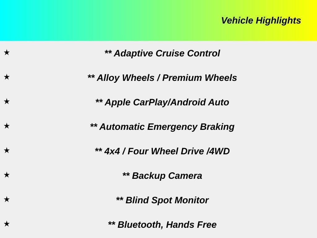 - Adaptive Cruise Control: Adaptive Cruise Control w/Stop & Go