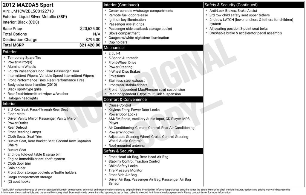 Liquid Silver 2012 Mazda Mazda5 4D Wagon Sport 2.5L I4 DOHC 16V VVT 21/28 City/Highway MPG 5-Speed Automatic with Manual Mode and Overdrive FWD