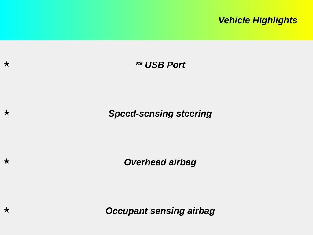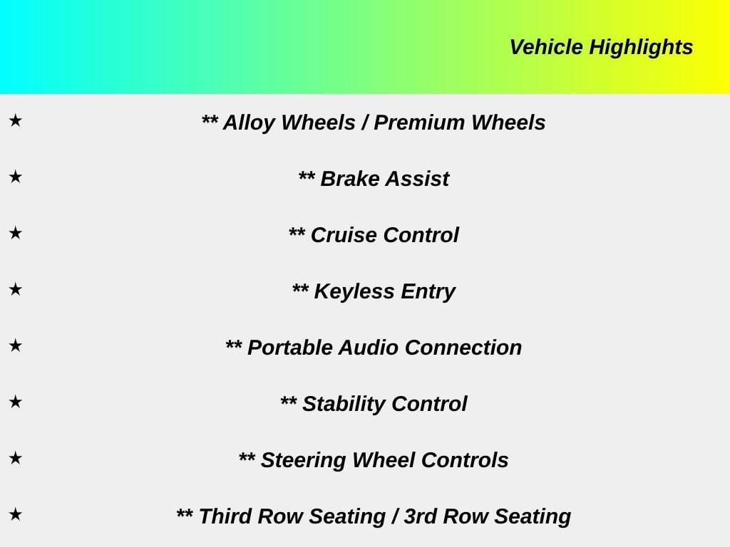 ** Alloy Wheels / Premium Wheels, ** Brake Assist, ** Cruise Control, ** Keyless Entry, ** Portable Audio Connection, ** Stability Control, ** Steering Wheel Controls, ** Third Row Seating / 3rd Row Seating, ** USB Port, Occupant sensing airbag, Overhead airbag, Speed-sensing steering.